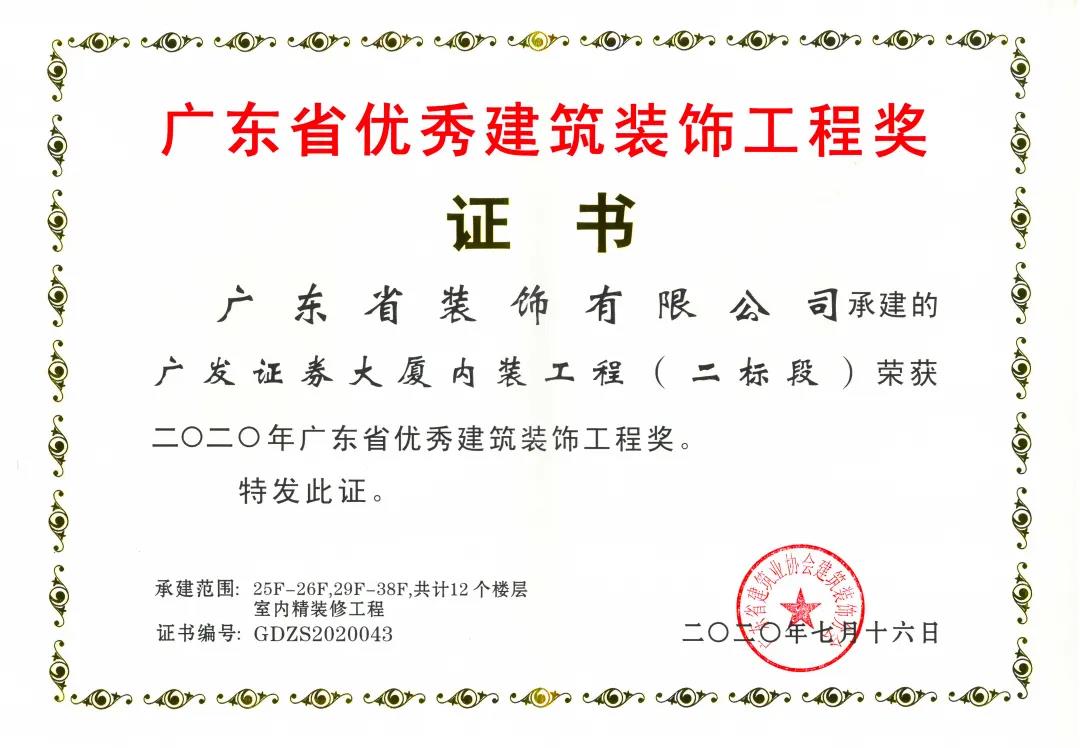2020年7月16日,廣東省裝飾有限公司共四項(xiàng)竣工項(xiàng)目被廣東省建筑業(yè)協(xié)會(huì)建筑裝飾分會(huì)評(píng)選為“2020年廣東省優(yōu)秀建筑裝飾工程”。