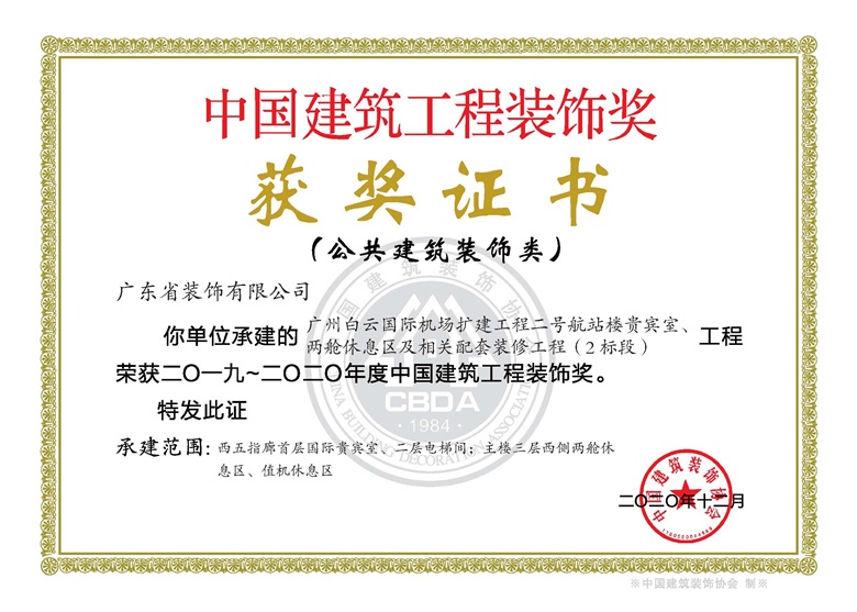 廣東省裝飾有限公司承建的廣州白云國際機(jī)場擴(kuò)建工程二號航站樓貴賓室、兩艙休息區(qū)及相關(guān)配套裝修工程(2標(biāo)段)工程榮獲2019-2020年度中國建筑工程裝飾獎。
