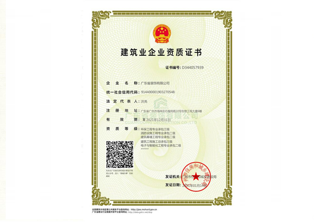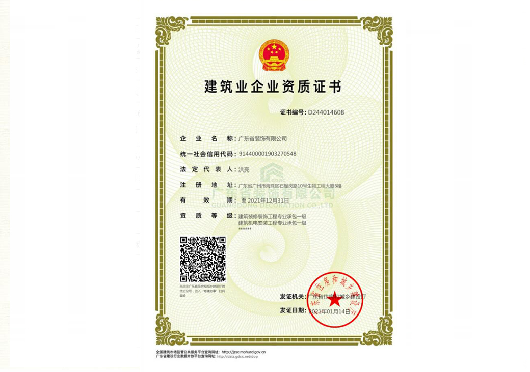 廣東省裝飾有限公司于2021年1月14日已完成“建筑業(yè)企業(yè)資質(zhì)證書(shū)”法定代表人變更,并由廣州市住房和城鄉(xiāng)建設(shè)局下發(fā)有效證書(shū)。