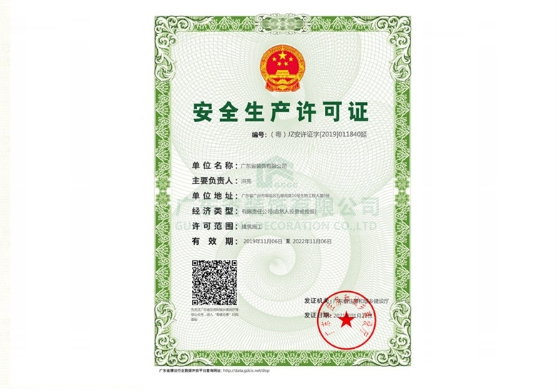 廣東省裝飾有限公司于2021年1月22日已完成“安全生產(chǎn)許可證”主要負(fù)責(zé)人變更,并由廣東省住房和城鄉(xiāng)建設(shè)廳下發(fā)有效證書。舊文件于成功變更之后即刻作廢!